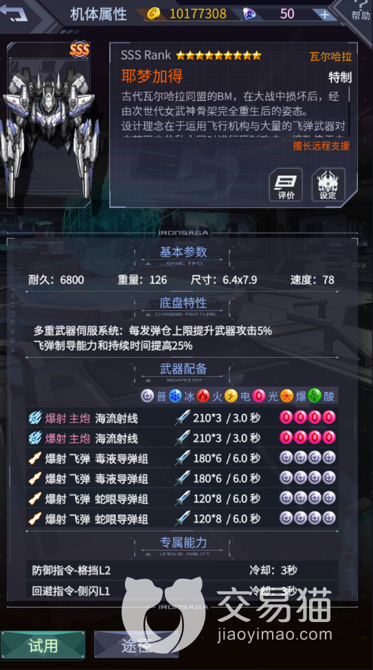 第二个机甲名称叫做耶梦加得,这款机甲拥有多重武器系统,不仅能刀能枪,甚至配备导弹和镭射炮,他还有一个额外的特性技能,没用有一个被弹舱就能提升百分之五的技能攻击力,可以说是十分的强力。