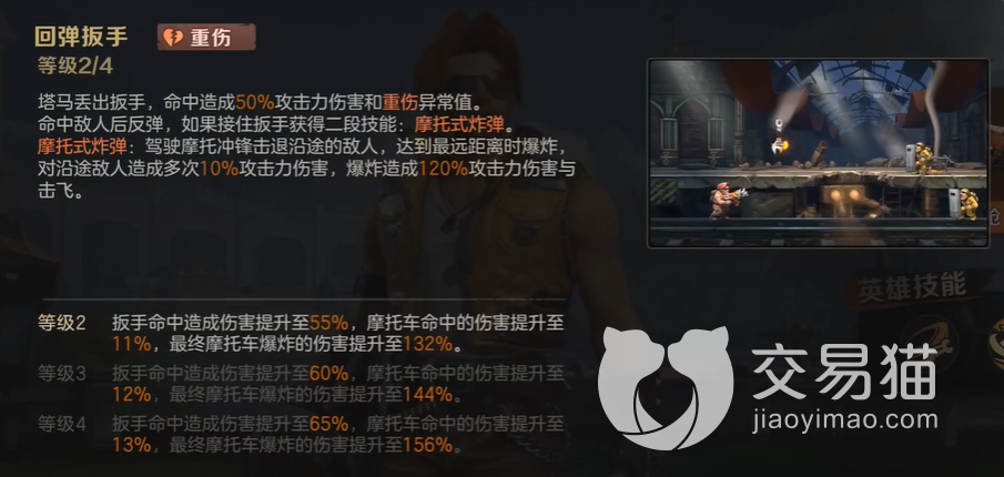 其实他的主要技能都是跟他的人设有关的,在原本的剧情里面,塔马罗文是一个会改装各类军事器械的角色,所以一技能是回弹扳手,这个技能是会将他手上拿着的扳手扔出去,并且在上面造成反弹一下,反弹的时候是向着塔马罗文的,要是角色接住了这个扳手的话,就可以将技能升级到二段,变成摩托车炸弹。