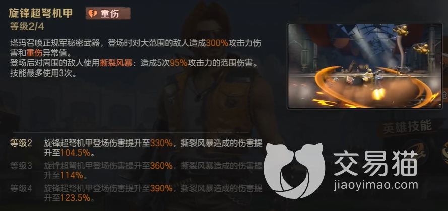 大招是可以召唤出来一只机甲帮助作战,而且在机甲被召唤出来之后,机甲也会有额外的效果,有撕裂风暴的效果,攻击力瞬间提升,在使用完这个效果三次之后,机甲就会爆炸,爆炸产生的伤害值就比撕裂风暴要低一点,但是通过这几个技能大家就知道,塔马罗文绝对是一个适合使用的角色。