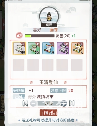 在世界地图上进行探索时,玩家经常会遇到一些修士,这些修士与玩家存在友好值的关系,玩家只要送给他一些喜欢的东西,就能增加彼此之间的友好值,例如书画、残卷等。这些赠礼所需的物品可以通过打怪获得,也可以从一些集市上购买,获取途径还是比较多的。