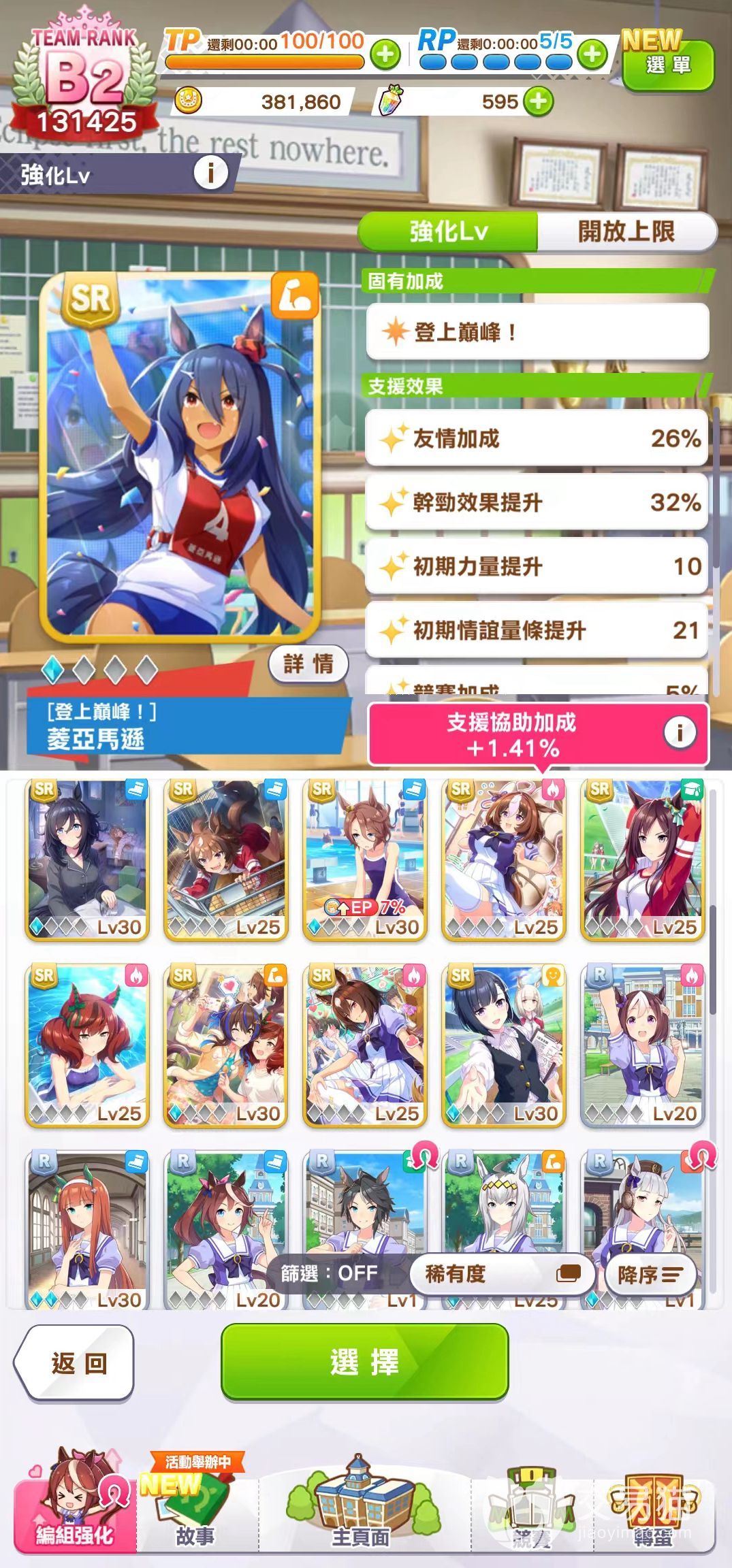 作战推荐选择领头/前列,固有技能在领头/前列作战时可以稳定发动,配合支援卡编组,可以放心地选择这两个战术。但是觉醒Lv5开放的技能压倒性领先很难在前列战术时发动,所以还是比较推荐全选领头。
