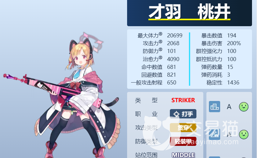 才羽桃井的定位是贯穿类型前排输出,防御类型是轻装甲,擅长城镇战和户外战,应对轻装甲敌人和室内地形时显得有些乏力。