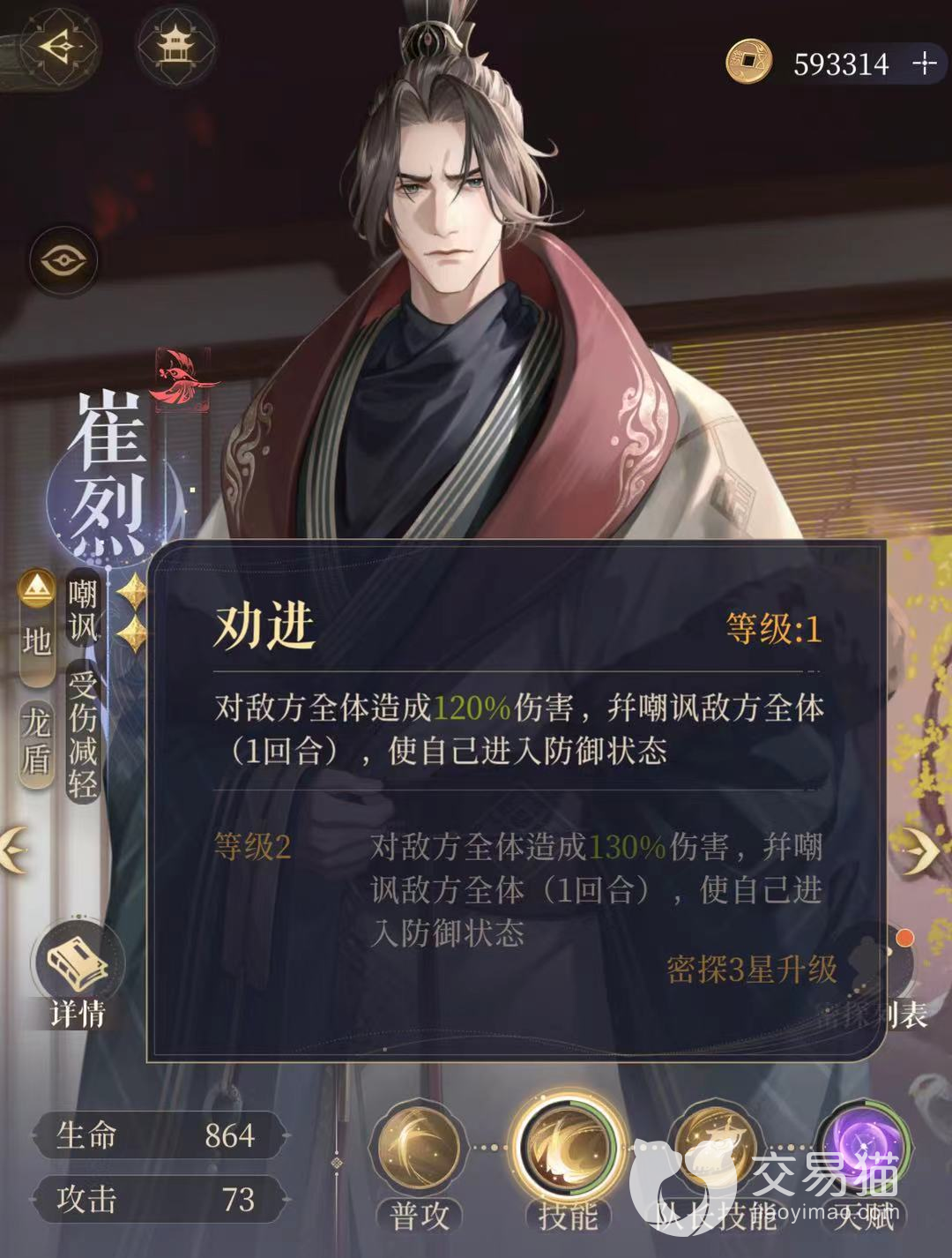 崔烈在这个阵容里面担当嘲讽敌人扛伤害的位置,配合史子眇回血,还有三位强势的单体输出,不怕阵容没有伤害。