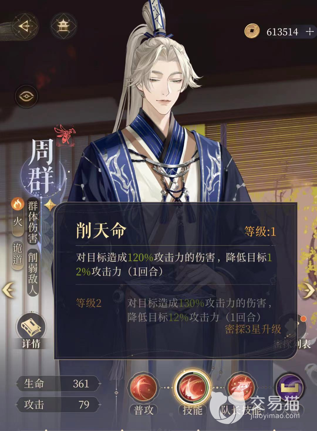 大招:削天命等级1时,对目标造成120%攻击力的伤害,持续一回合降低目标12%攻击力。升级等级2时,对目标造成130%攻击力的伤害。
