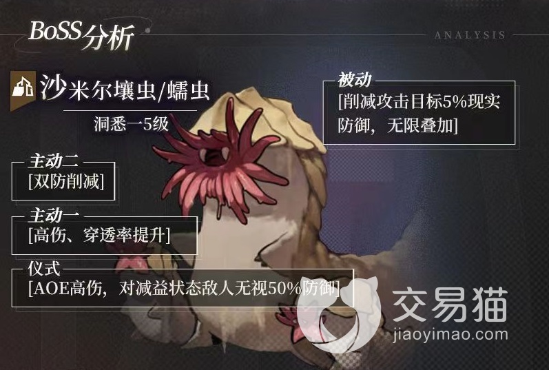该boss主动技能可以消减防御,并且拥有伤害高穿透率提升状态,还有很强群体伤害,如果身上带有减益效果,会无视部分防御。另外它的被动削减现实防御属性能无限叠加,这就意味着战斗后期压力将会非常大,所以小编才会说越早击杀就越简单,各种想要拖后期的续航流,都将在这里迎来压力。