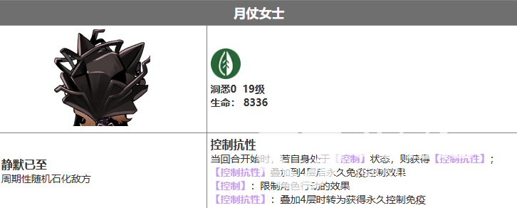 之后则是注意boss机制的问题,木夫人作为木属性的boss,是很擅长控制的,技能“静默将至”将有很大的概率石化我方的角色,所以小伙伴们在与石夫人对战的时候,一定不要将一个角色的卡牌全部出光了,不然如果其他角色都被石化无法行动的话,那么我们就相当于空过一个回合了,这是十分致命的。