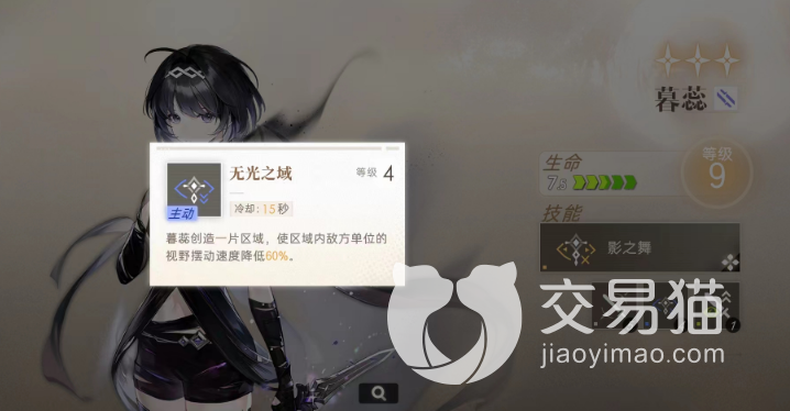 这个角色的小技能交错无光之域,冷却达到了15秒,能够创造一片区域,使得这片区域内的敌人视野摆动速度大幅度降低,4级的技能能够达到60%的效果,对于一些视野转速非常快的敌人能够起到很好的限制作用,也让队伍中其他角色能够有更安全的输出空间。