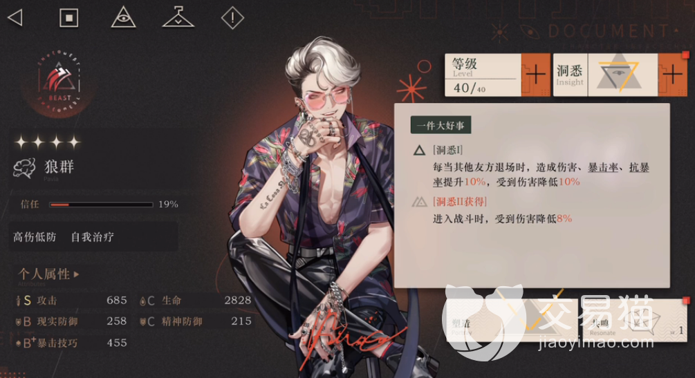 狼群这张角色卡,拥有全阶段的增伤、单攻群攻兼备、吃献祭以及能续航等特点,成为游戏中四星角色首选。狼群在输出方面可谓是非常给力,得到了4星的评价。作为一张4x卡,其属性得到了特别优势,并配合高系数的attack卡牌,能够完美有效的打出高爆发伤害。此外,狼群的输出方式也非常灵活。当自身高于50%生命时,“脏东西”能够大幅增伤,而自身低于50%时,“可怜虫”也能获得同等收益。这代表着狼群能够在整个战斗阶段都保持伤害增益的效果。因此,无论是单攻还是群攻,狼群都能完美胜任。
