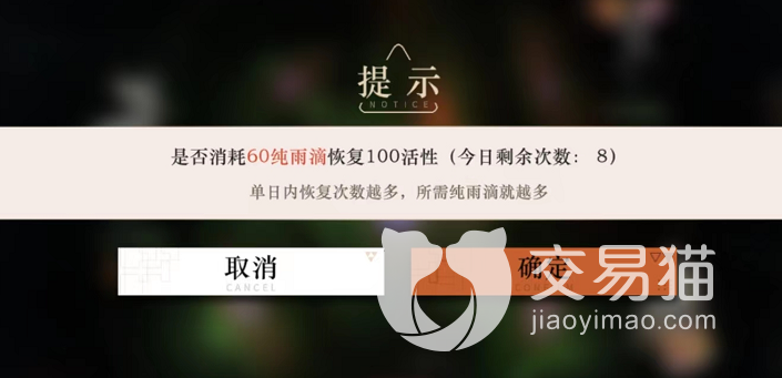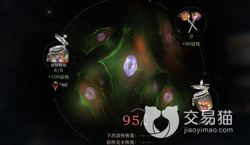 目前游戏内获取活性的方法其实有很多种,首先第一种就是自然恢复,这个大家应该都能理解,当我们的活性值低于最高上限时,那么每隔五分钟就可以恢复一点活性。玩家们可以通过升级等多种方式来提升我们这个活性的数值上限。另外,玩家们也可以通过使用道具的方式来恢复活性,我们每月都可以使用纯雨滴来购买活性,60点纯雨滴可以获取100点活性,每日可以购买八次。