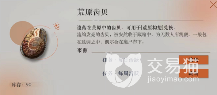 荒原齿贝的外观就是一个发亮的贝壳,玩家们可以将其用于各种场所。目前游戏内荒原齿贝的获取方法只有一种,那就是通过任务获取,无论是每周任务还是每日任务,我们在完成对应的任务之后,都能解锁一定数量的荒原齿贝。