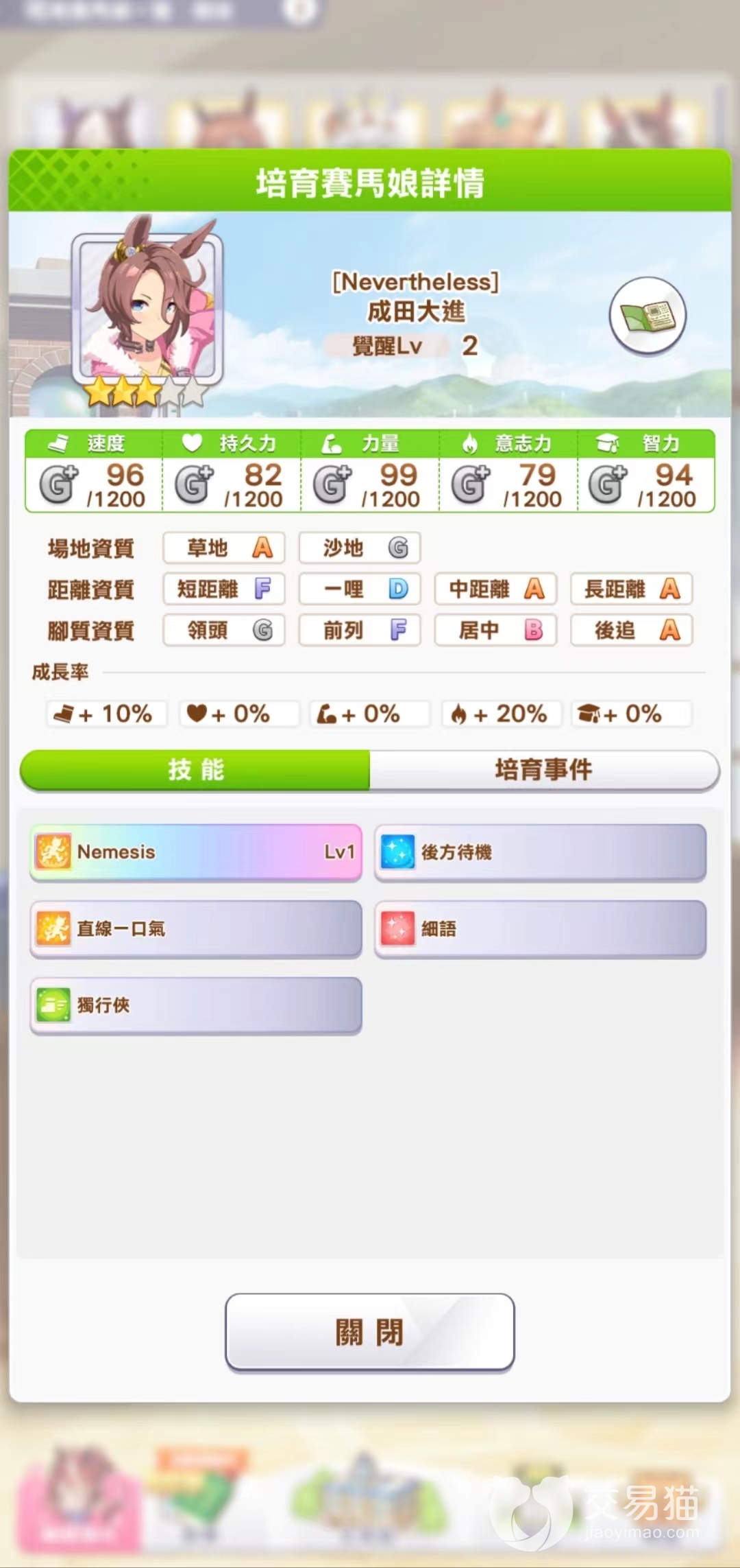 成田大进本身的后追脚质为A,虽然居中脚质也有B,但是用居中作战的话容易开不出固有技能,所以推荐还是以后追为目标进行培育。在URA剧本内,只要还没有开始学到限制作战的技能,在基础素质达标的情况下都可以选领头作战。选择不合适的作战只会影响智力的数值,智力又主要影响技能发动概率,所以选领头作战对属性影响很小,还可以防止前方被堵无法突围的情况。