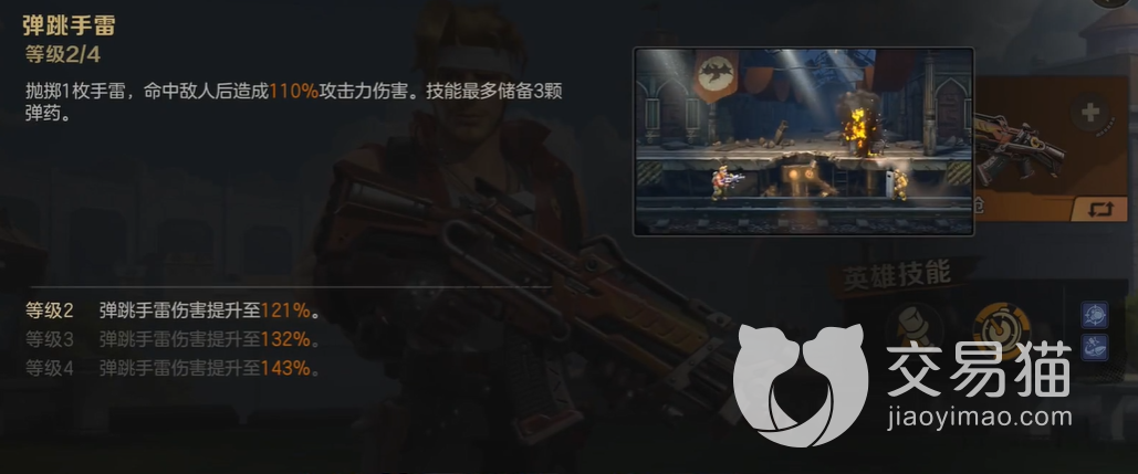 他的一技能是弹跳手雷,这个技能是一个常见技能,基本要是遇到的是小怪的话,用这个技能不心疼,使用的时候会像前方丢出去一颗手雷,造成爆炸伤害,不过这个手雷是需要大家前期储备的,要是没有储备到三颗的话,想要连着丢出来是不行的,所以需要时间准备哦。