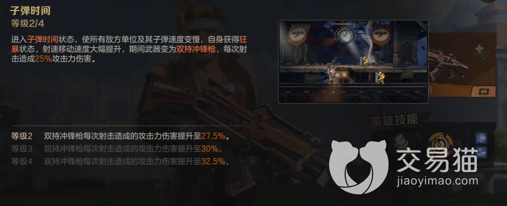 第二个技能相比第一个技能的伤害要更高一点,而且射速更快,第一个技能是丢出去手雷,第二个技能则是子弹时间,会从手枪里面发出大量子弹,而且这个时候角色也会进入狂暴的状态中,所以比较适合对面的敌人比较多的情况。