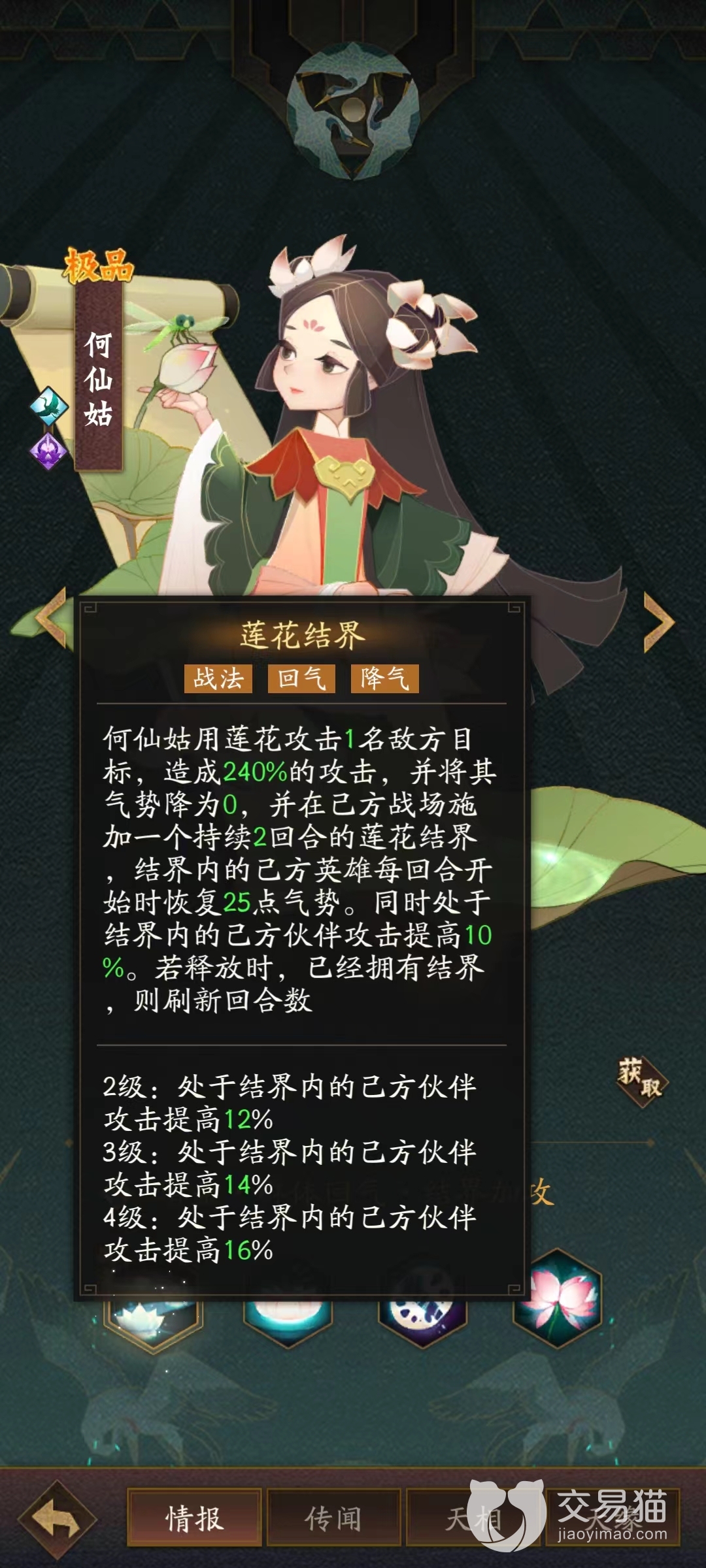 其次就是何仙姑,通过释放大招能够将敌方一个目标的气势降低到0点,同时给全体队友施加一个莲花护盾,持续回复气势,能够让燕子更快的释放大招积攒符纸。