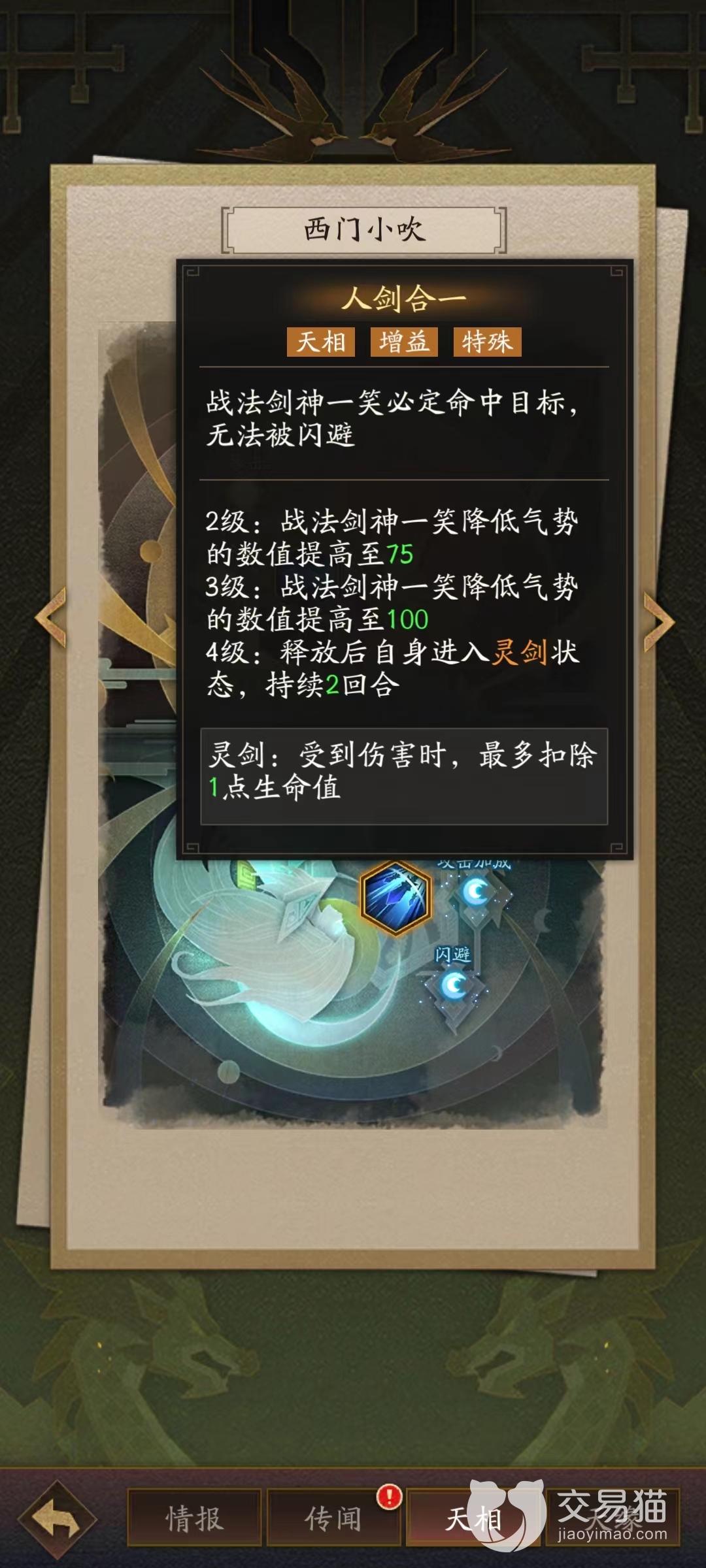 首先就是西门小吹,最关键的是其天相“人剑合一”的效果,能够让自己释放的战法百分百命中敌人,同时升到4级之后,能够强制降低敌人100点气势,受到伤害之后最多扣除1点血量,这就保证了对方无法释放战法。