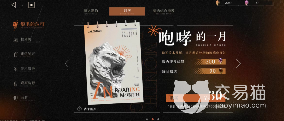 如果说首充双倍也只能有一次机会的话,想要持续的获取纯雨滴,那么在游戏中建议各位玩家们选择月卡咆哮的一个月。价格方面是正常的,月卡价格30元一次,可以每月续费使用。但获得的却是丰厚的奖励,除了立即获得30元300点纯雨滴以外,每天还可以获得90点雨滴也就是普通的抽卡水。统计换算下来,如果每天全部签到领取了,那么一般情况下可以获得300点纯雨滴加2700点雨滴。总共加起来一个月,大概获得3000点水左右。