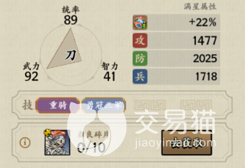 从属性上来看,它的统率能力和武力值都非常的惊人,远远超过了蓝色品阶武将该有的属性。如果不是因为他的智力属性比较拉垮,他肯定是处于紫色或者橙色武将的位置了。