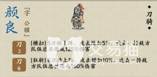 刀骑这个兵种在之前给大家介绍的文章当中就有说过。那个兵种就算不看角色都能够知道其实力强盛。颜良在游戏里的定位就是刀骑。