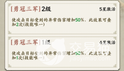 颜良这个武将的技能叫做勇冠三军,最高只能提升到二级释放之后,能够使攻击目标受到异常伤害。随着等级的提升,叠加的效果次数会得到增加。这个技能在战斗当中不少玩家觉得作用不大,但是特殊战斗当中能够发挥出意想不到的效果。