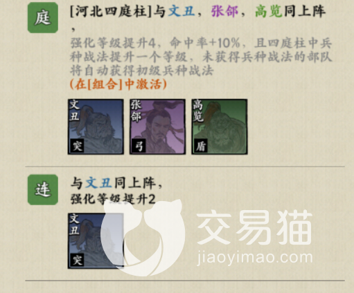 颜良这个武将最适合和文丑,张郃以及高览共同搭配组合成为一个阵容。这个阵容组合成功上阵之后,命中率会提升10%,并且整个部队当中的战法都会提升一个等级,没有战法点不部队也会瞬间获得初级兵种战法的奖励。