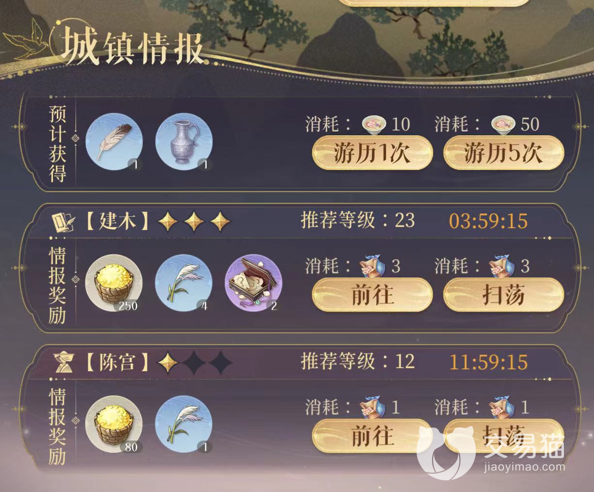 2、据点情报。每次收集聚点资源,都有概率刷出不同等级的情报,消耗行囊1~3个即可通关一次,一星级情报获取80个粟米,三星级情报获取250个粟米。