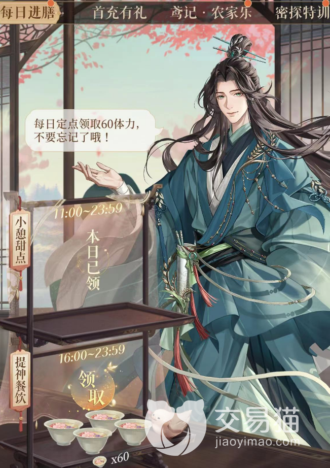 其次游戏里面还有每天两次的恢复体力节点,点击屏幕右方活动界面,可以看到陈登喊你吃饭,11点之后可以领取小憩甜点、16点之后可以领取提神餐饮,这两个都是60体力值,道具领取时间截止到当日23:59。