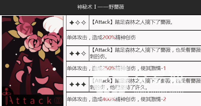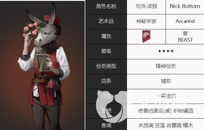 尼克波顿是一个四星级角色,他是一个非人的存在,作为其中的一个神秘学家,拥有一瞬之忆的功能,帮助玩家们带来精神创伤的同时还拥有一定的辅助效果。他的三个技能都是比较强大的,第一个技能为野蔷薇,可以进行单体攻击,对敌人造成最高400%的精神创伤,还能使其激情快速下降。