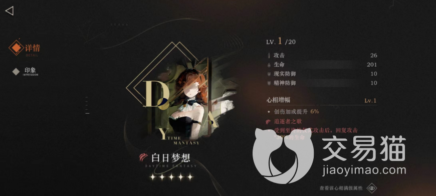 白日梦想是一个五星心相,在游戏内属于比较稀有的存在,拥有一定的属性加成,可以帮助玩家们提升攻击、生命、防御属性,还拥有创伤加成的效果,最高可以叠加6%左右,在对战中的时候如果佩戴了这个心相,那么我们在受到仪式攻击的时候可以自动恢复自身攻击效果30%的生命值。