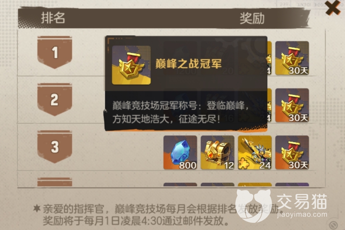 巅峰竞技场是玩家间的战斗,每天有5次挑战机会。指挥官们可设置进攻阵容,并选择对手进行挑战,在挑战榜单上能看到对方的排名、积分、战力等;设置防守阵容防御其他人的进攻。不论哪种阵容,最多上阵3位英雄+1辆载具。
