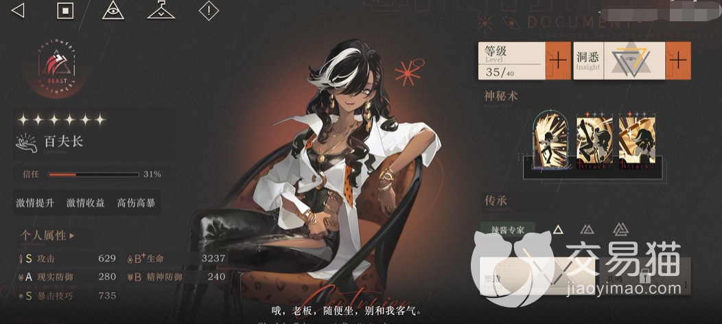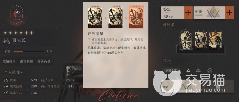 一技能的初始创伤值不算很高,主要是有额外的提升,带来自己激情值20%的创伤,所以要是这个百夫长的激情值比佳高的时候还是适合用这个技能的,要是激情值一般般的话,这个效果就只有上面160%创伤值。