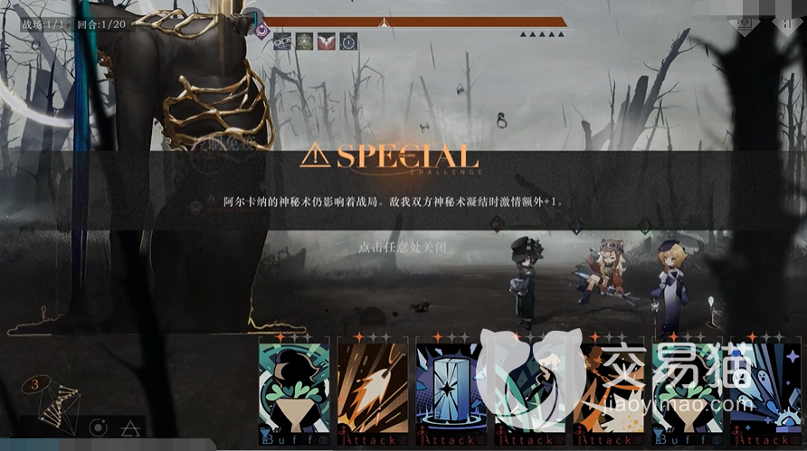 如果你的技能卡有伤害,但是标识为“debuff”,那么还是可以正常打输出且不受到此状态带来的激情增减影响的,其中比较典型的有苏芙比的“三重药量”,以及槲寄生“风入林”的二星和三星版本。所以大家在打这一关的时候可以选择带上这些角色,没有的话影响也不大,只要记住奇数回合攻击,偶数回合加buff或者移牌即可。