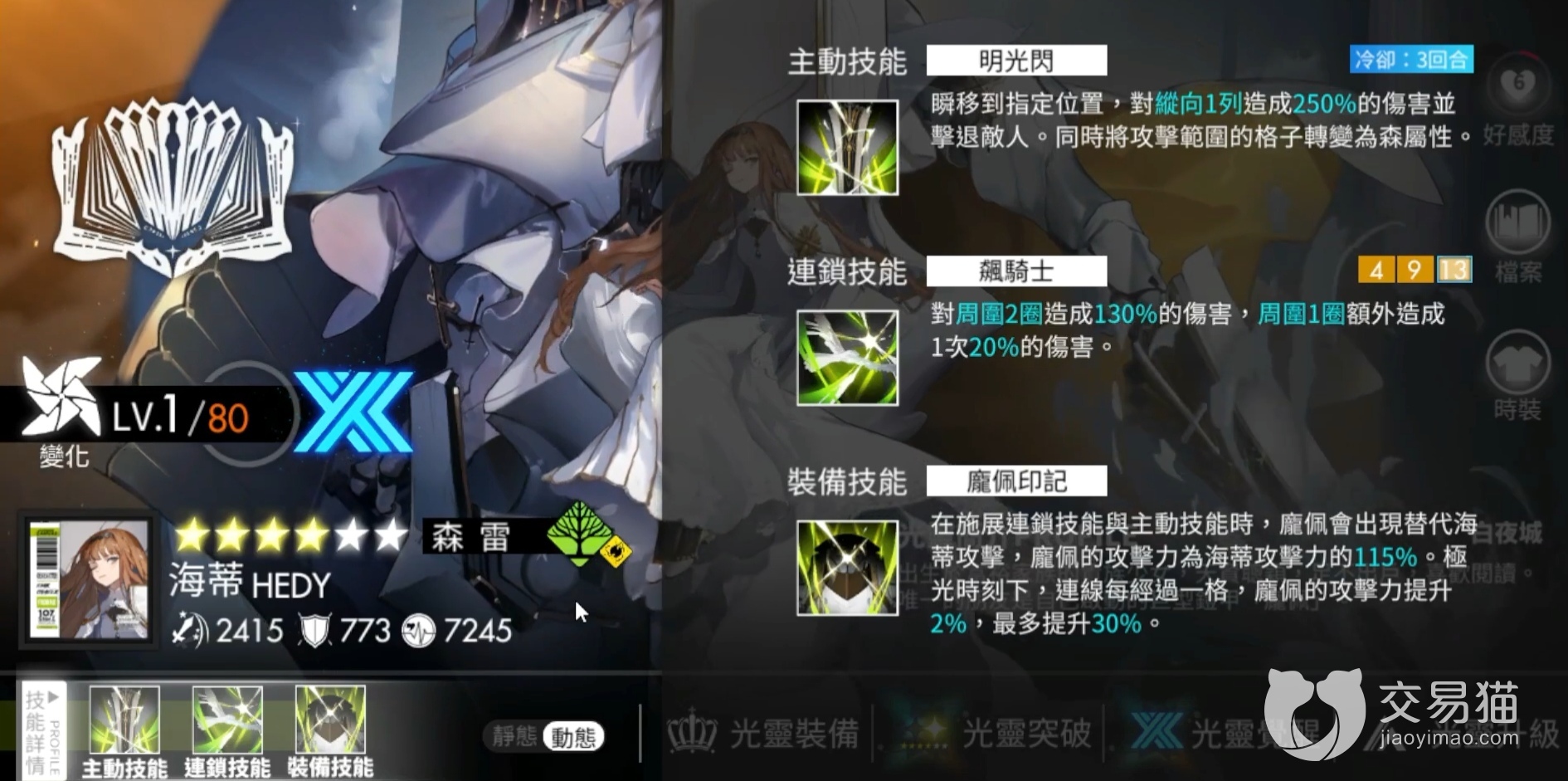 在阵容中,海蒂的职位是转色,也可以当个辅助,她的主要作用就是去提高阵容整体的灵活性以及制造森属性的格子,若是作为辅助的话,海蒂的输出伤害可以增加队伍的整体输出收益。实际上,海蒂的基础属性面板是很优秀的,没有拉胯的地方,可以说是一名全能型的光灵,在强化后能够拥有强大的爆发能力,海蒂比较依赖极光和连锁输出,平A普攻伤害不高,因此她的提升空间不是很高,同时小伙伴们要给她搭配一个合适的真人阵容才能让她战斗中有出色的发挥。