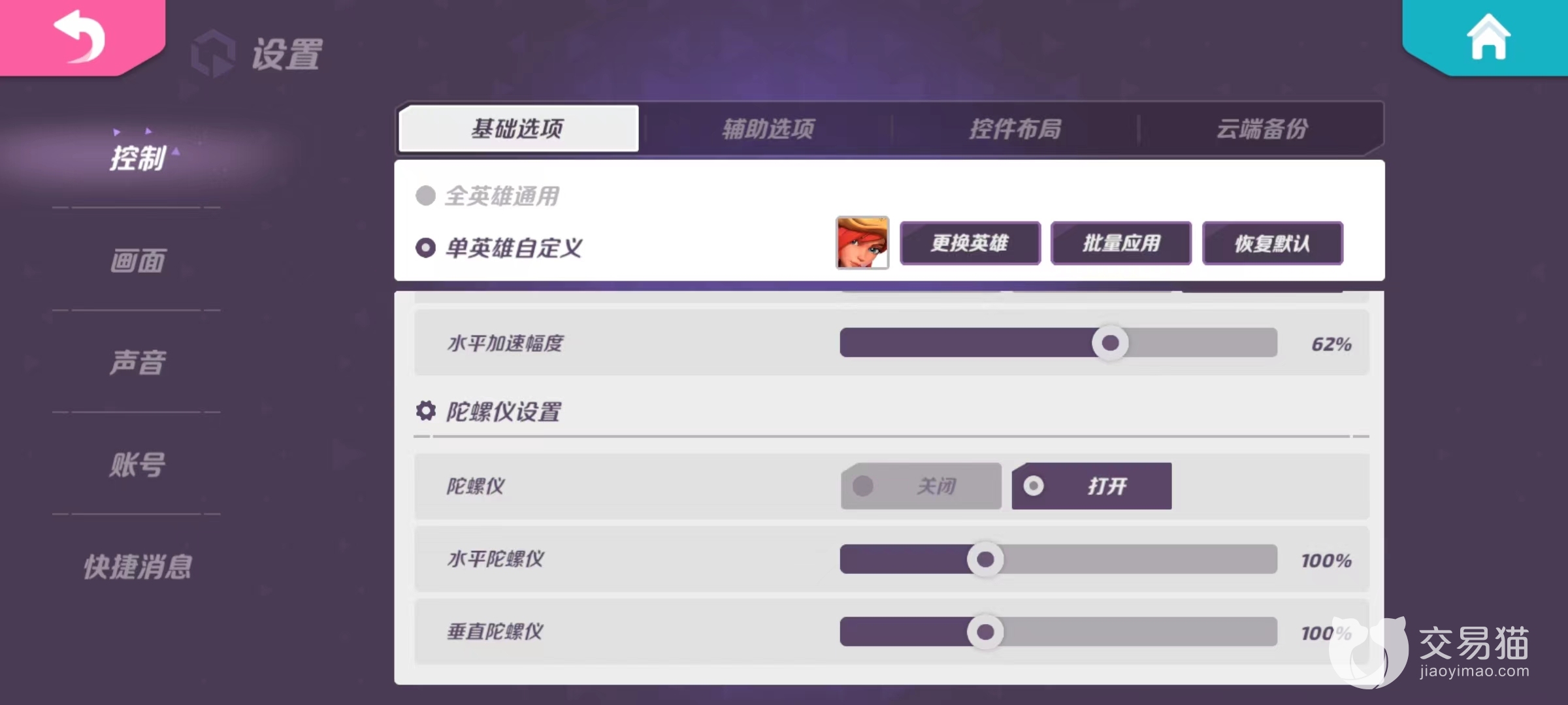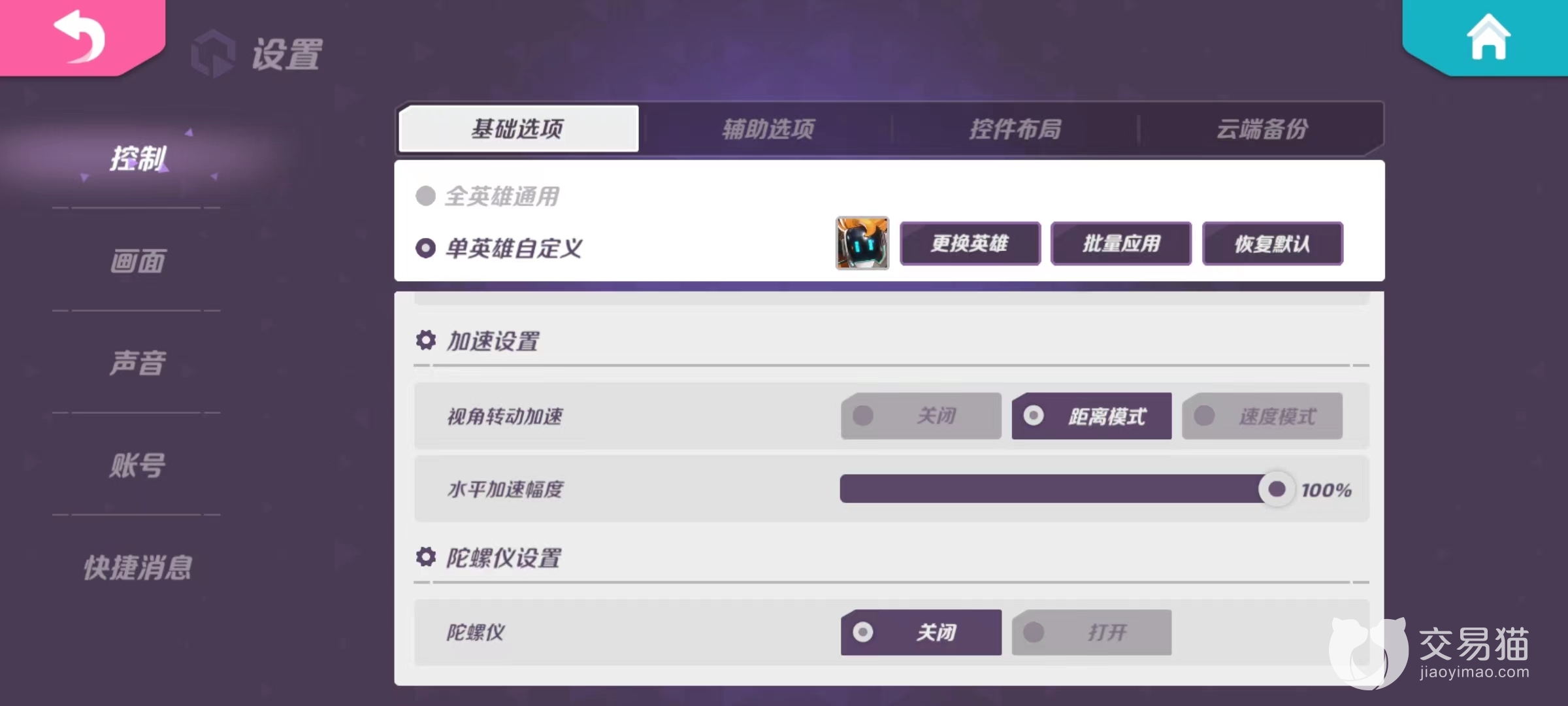 在游戏界面右上角点开后可以看到“设置”选项,在设置选项中的“控制”选项卡中就可以找到“陀螺仪设置”。需要注意的是系统默认的是关闭陀螺仪,这也就意味着如果玩家平时已经适应了关闭陀螺仪的操作手感,那么打开陀螺仪后不可避免地需要进行一个短暂磨合,推荐刚刚打开后可以在单人模式下进行测试,以免直接开启对战时由于不适应而影响心态。