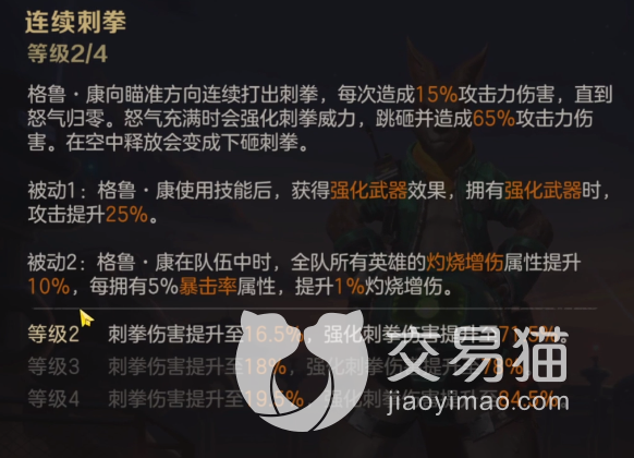 一技能上面还有两个被动效果,第一个被动是可以武器强化效果,武器伤害会提升25%,第二个被动就是为队伍带来灼烧属性提升10%的效果,要是暴击有提升的话,每次提升5%灼烧就会增伤1%。