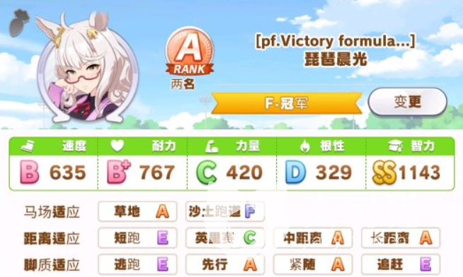她的天赋加成是智力和根性,这里推荐大家给她的智力进行提升,因为她是一个中长先行马,所以就需要将她的耐力给叠加上去,有耐力才能在后面也能跑得很快,因此在培养她的话,就需要走耐速流,可以给她带上两张智力支援卡,拥有这两张卡片之后,到后期经过培养之后智力就非常容易到双s了。