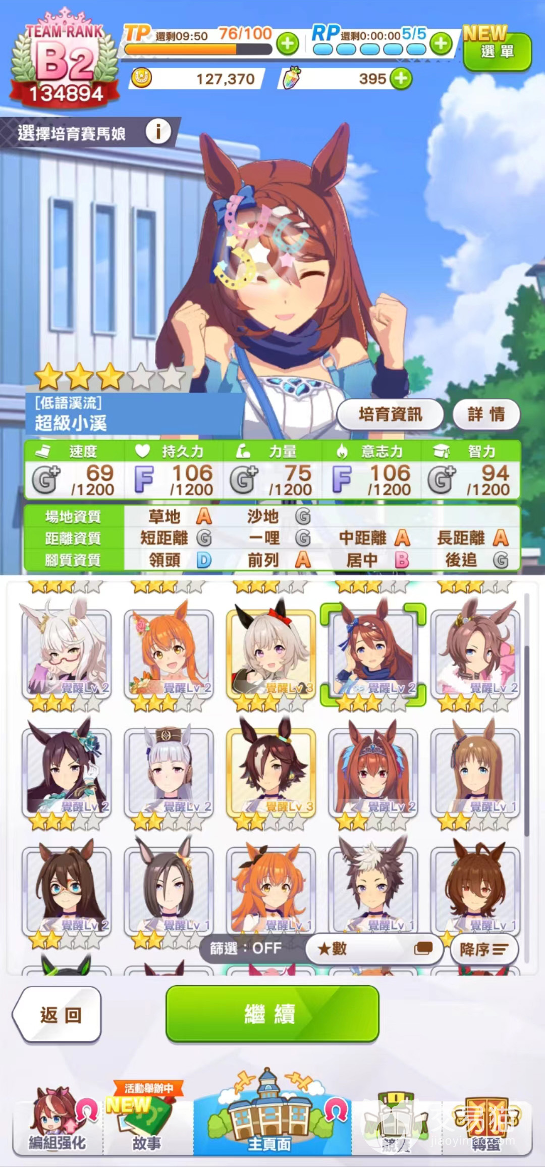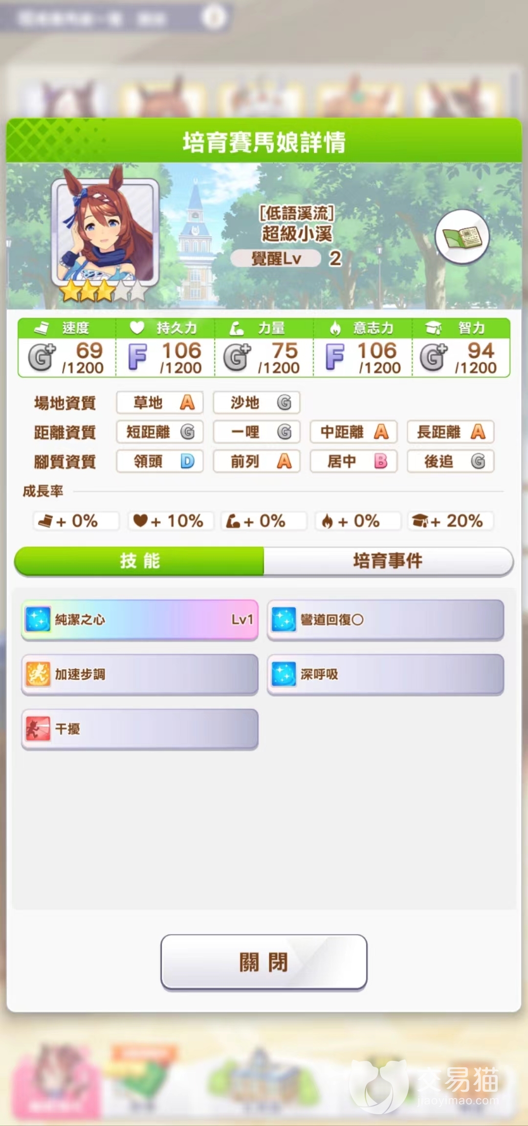超级小溪中和长距离的距离资质都有A,培育时要特别注意速度和持久力这两个属性,只要这两个属性足够好,培育中的长距离比赛都能轻松获胜。同时还要注意其他属性的平衡,只有速度和持久力特别高的话也不能保证获胜。如果编组支援卡片选的都是速度·持久力卡的话,就要尽量继承力量因子,保证力量的属性值不会特别低。