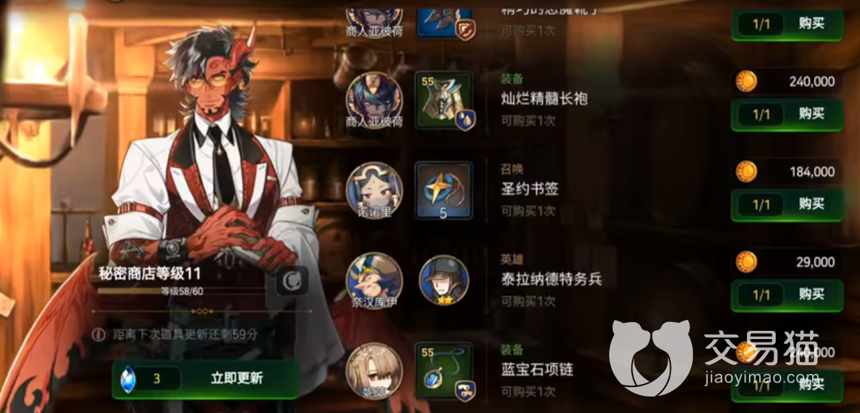 1、酒保这个NPC就是在大厅挂机一脸红颜色的那个家伙,可以在酒保的商店使用3钻石进行刷新,有一定的几率刷出5书签和50神秘。虽然不算是特别的不稳定,但酒保商店依然为目前该游戏中“书签”的主要来源。