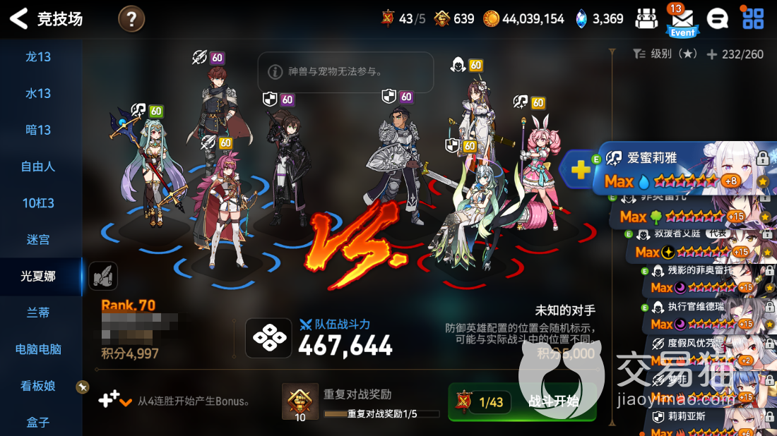 1、其实大家对这种游戏的竟技场玩法也算是非常熟的,因为绝大多数的同类型游戏都有这么一个玩法在。在该玩法的界面上可以看到积分系统,到了相对应积分就可以晋阶为相对应段位。