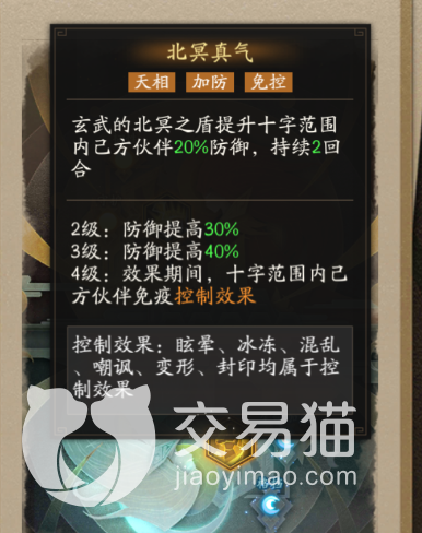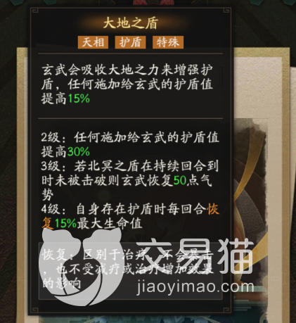 而在它的等级提升到三级的时候,并且在一个回合结束以后,角色的护盾还没有被对方击破,那么就会直接恢复他一定的气势值。而在其等级达到四级的时候时候,在有护盾状态下的效果就是每个回合会恢复他一定的血量。