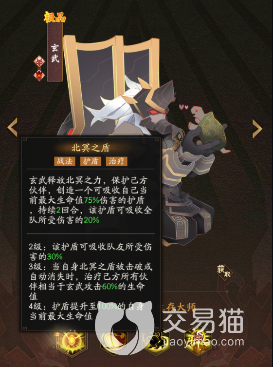 当前可以知道的是玄武有两个天相,其中有个叫做大地之盾,它的效果是角色会吸收大地之力来提升自己的护盾值,让所有能为角色提供护盾效果的加成都再进一步提升百分之十五,而在其二级的时候此效果还会进一步增加。