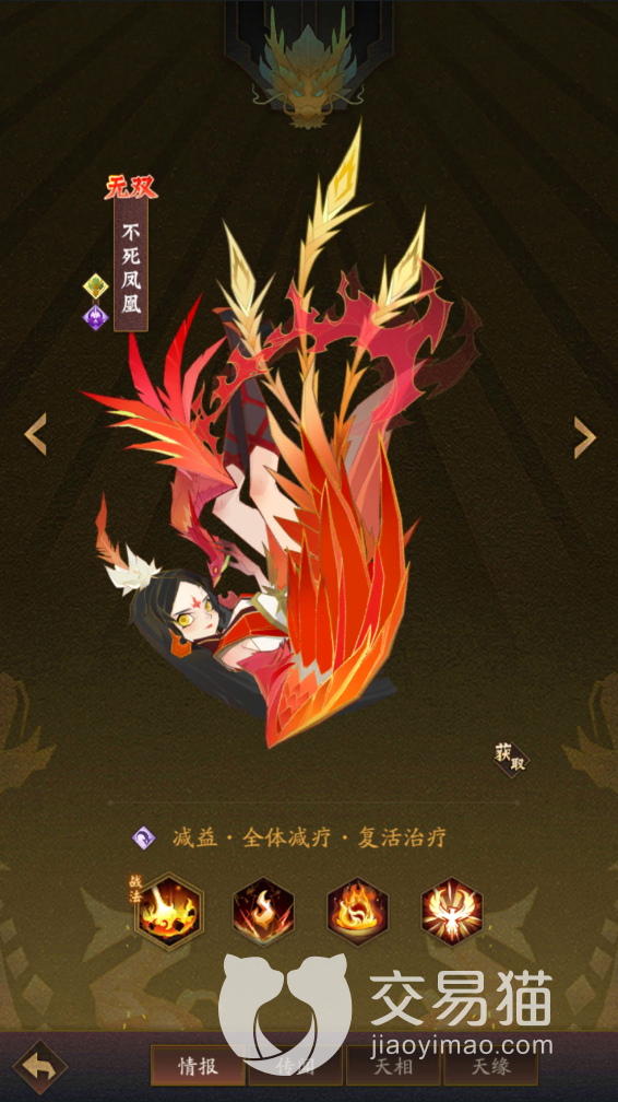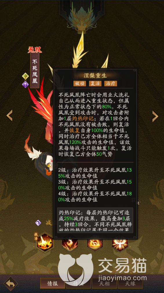 被动技能名为涅槃重生,当这个角色阵亡时,能够用业火洗涤自身,从而进入重生状态,不过属性也会略微下降,如果当前回合中,复活中的角色没有死亡,那么就能够回复满血状态,同时治疗全体队友极高比例的生命值,不过一场战斗中这个效果只能够触发一次,复活之后还能够回复全体队友一定气势,当凤凰受到伤害的时候,会给攻击者附加上一个灼热debuff,能够造成一定比例的减疗效果,能够很好的针对敌人。同时每个回合开始的时候,也能够给地方随机一个目标附加上这个buff,这个效果最多叠加三次,能够持续三个回合,是一个非常优秀的减疗机制。同时大招能够给所有敌人造成大量伤害之后附加上两层buff,如果大招升到了3级,每一层buff还会受到凤凰额外的真实伤害,技能机制非常全面,能够很好的克制敌人。