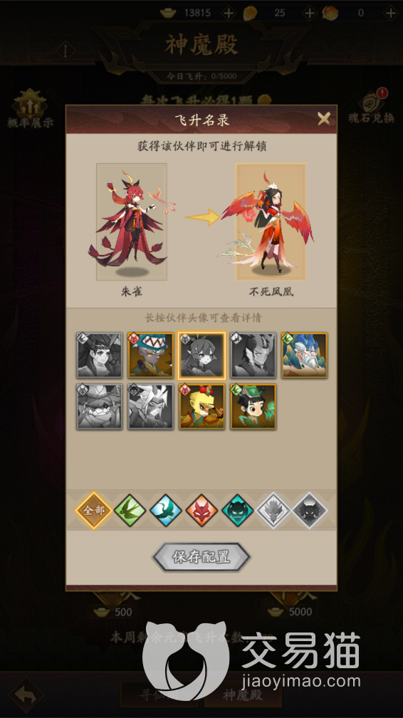 这个角色的获取方式是比较困难的,毕竟作为游戏仅有的九个神魔角色之一,除非运气爆棚,否则像要获取至少需要花费数万元宝。想要获得这个角色的话,需要现拥有前置角色朱雀,是一个妖族的极品伙伴,获取的方法相对来说是比较简单的,然后小伙伴们需要在神魔殿中,选择朱雀进行飞升,每次飞升需要花费500元宝,不过只有2%的概率能够获得不死凤凰,并且这个角色的升星也是需要相同的本体,所以也能够看出想要获得这个角色以及提高这个角色的练度有多难,所以小伙伴们需要量力而行哦!