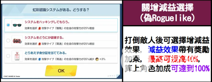 大家在活动的过程中需要注意一些新机制,在每次击败地图上的一些敌人后,便可以进行一次buff或者debuff的选择,玩家们可以随心所欲地选择适合自己能力的buff,着重强调,选择buff能够增强队伍的战斗力,从而使得通关更加容易,但如果选择debuff的话,便可以获取更多的活动奖励,通过选择最多可以获取40%的奖励加成,所以在队伍战斗力强大的情况下,小编还是建议选择一些debuff来提高奖励~