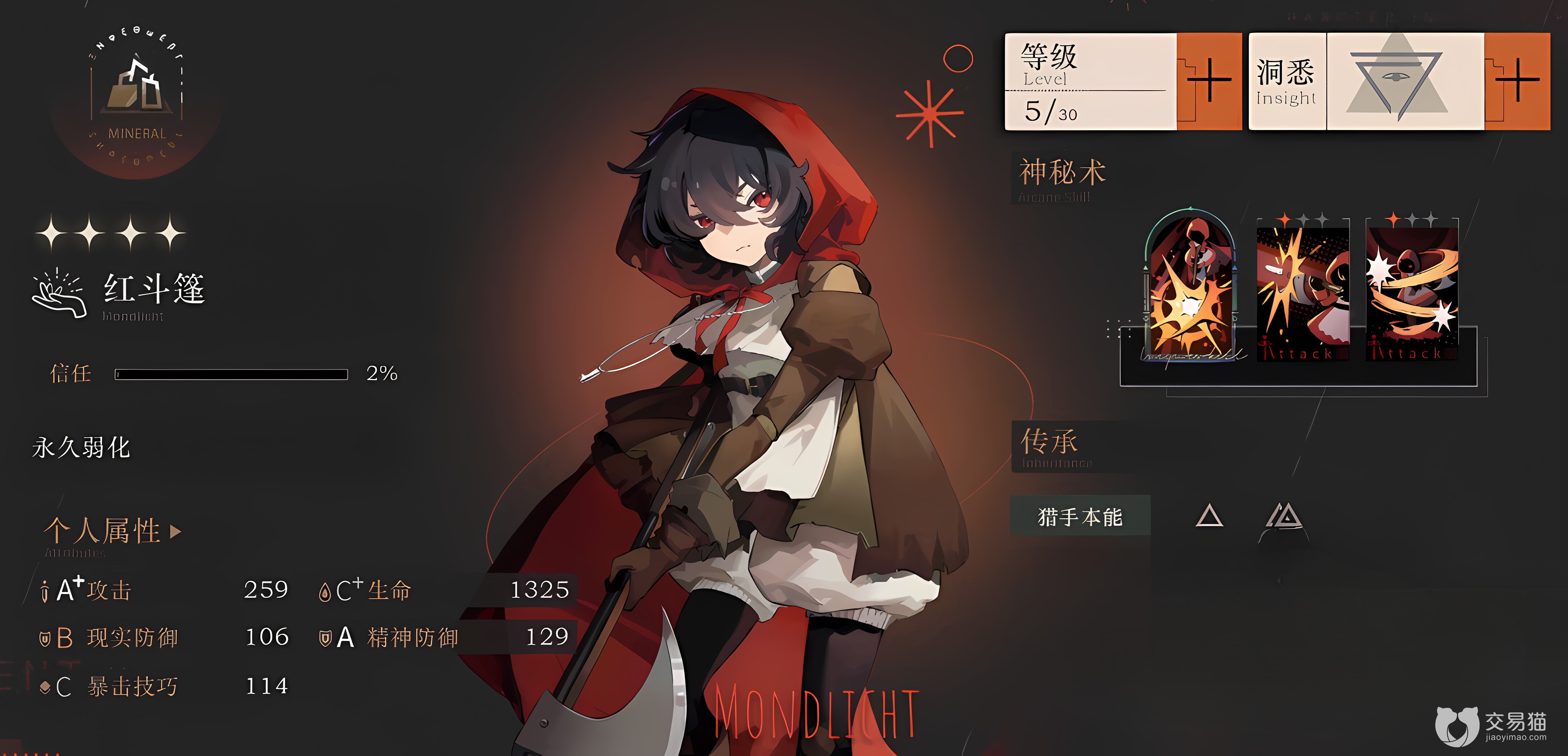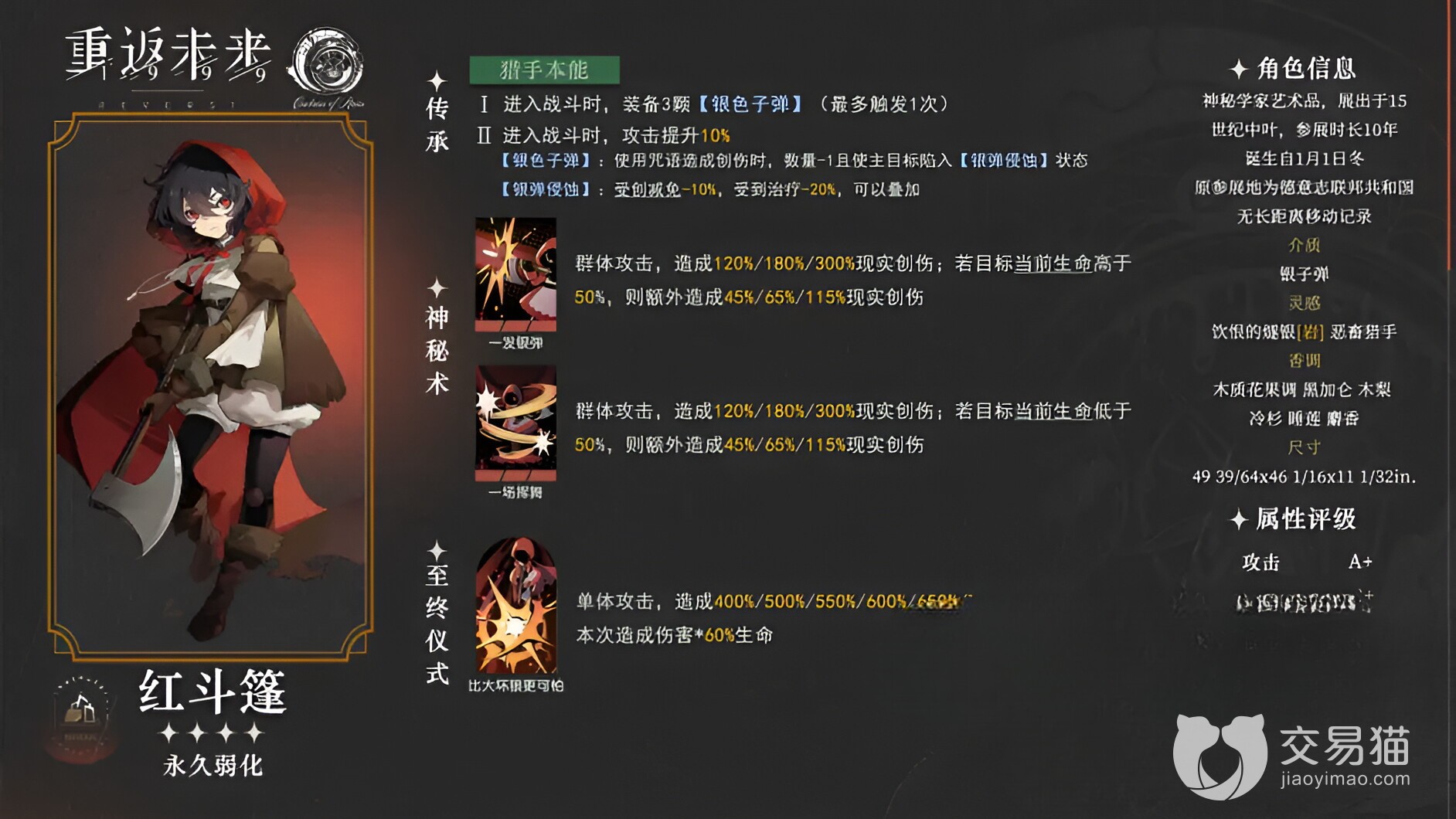 红斗篷是一个四星级的岩属性角色,它能够永久的弱化敌方的目标,这是传承技能所给他带来的技能效果,提前装备好三颗银色子弹,再使用咒语就可以对敌人造成伤害并且同时施加银弹侵蚀效果,这时敌方的治疗效果会被迫降低20%,承伤也会减少10%,对敌人的压制力是十分强悍的。