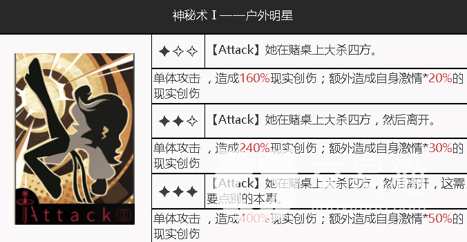 很多玩家不会使用这个角色,没关系,我们在攻击的时候可以先使用大招进行消耗,然后一技能收割,培养角色之前也需要给角色进行洞悉,洞悉可以增强激情点,帮助我们提升攻击伤害,暴击率以及生命值都能大幅度恢复,她的攻击以及暴击效果都是S级。在使用的时候,玩家们可以将其作为一个输出C位进行使用,了解了其定位之后,我们也能更好的搭配阵容。