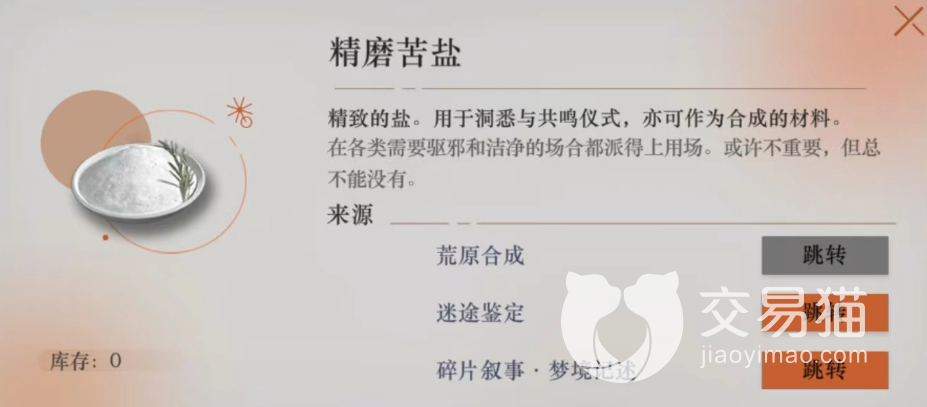 第二种方法就是通过合成,玩家们可以前往荒原去合成,只需要转别150哥金币以及4个苦盐簇就可以合成一个精磨苦盐。最后玩家们还可以通过购买获取,我们进入迷途鉴定板块以及碎片叙事之中都是能看到精磨苦盐的购买链接,花费对应的货币就可以完成购买了。