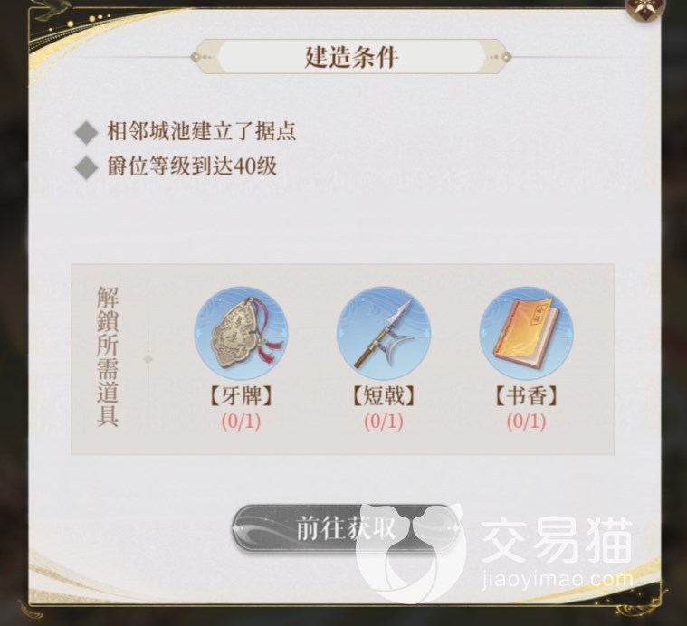丹阳据点的建造前置条件是相邻城池建立了据点,这里相邻的城池就是指偃师,然后玩家爵位还要达到40级。而偃师据点则要东阳先建立据点,东阳的话需要完成兰台25关的挑战,真是一环套一环。