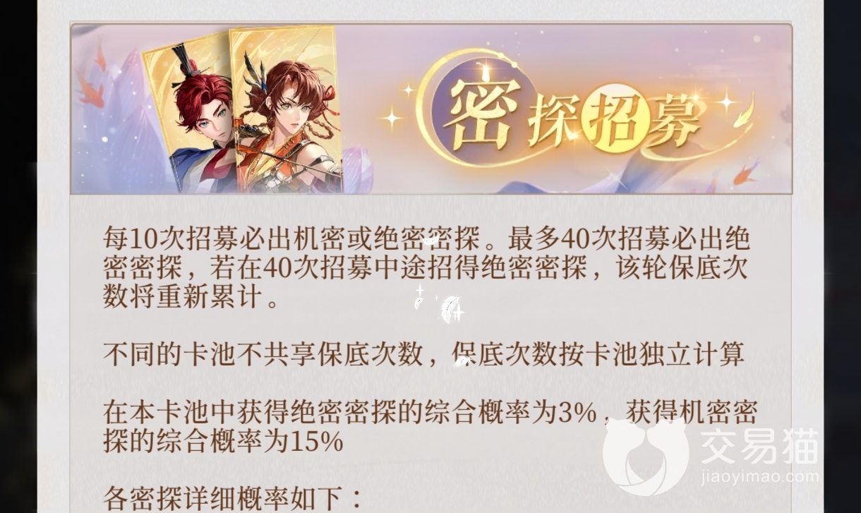 代号鸢中的卡池分为两种,一种是常规卡池,一种是限定卡池。限定卡池中与常规卡是一样,都是40抽一保底。Up的角色概率会将较于其他五星角色概率翻倍,也就是翻倍成1.2%。1.2%的概率并不能保证40抽保底不会歪到常驻角色。