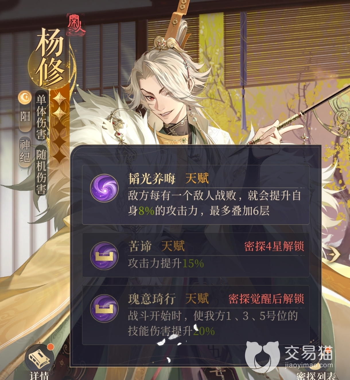 而一起up的常驻角色杨修更是本游戏中目前单体输出最高的角色,杨修虽然是新手就可以获得的角色,但是叠星之后的天赋技能十分惊人,可以给杨修自身带来很大的增益,叠星叠到满之后更可以给队伍中1、3、5位置的角色。增加高额的伤害,提高整个队伍的伤害。