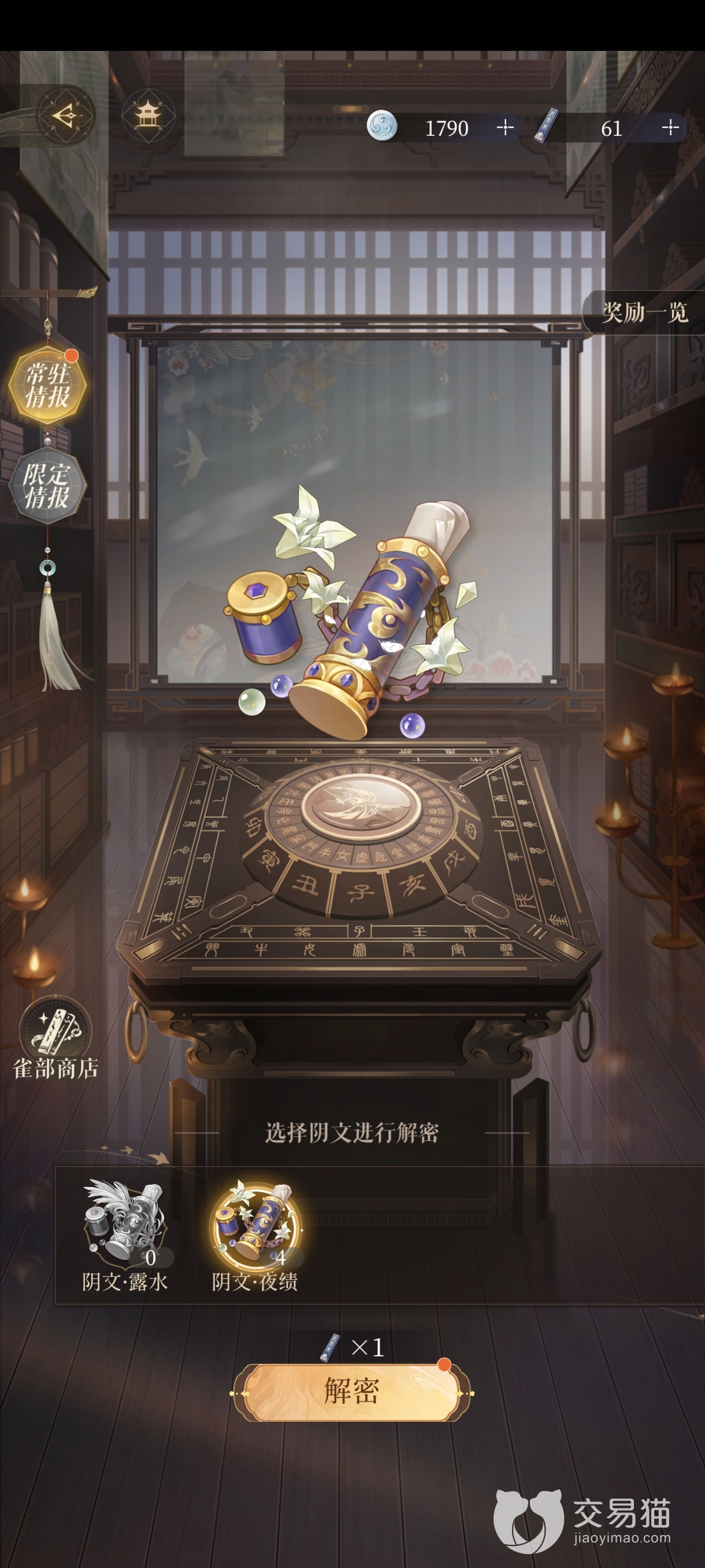 获得指定的相关道具之后就可以在念念中进行解密,解密需要的道具可以通过日常或者是奖励来获取。解密可以获得随机数量的账本或者是铜币,银币。等等傅融的每一个恋念需要的账本数量都不一样,越到后面需要的账本越多。